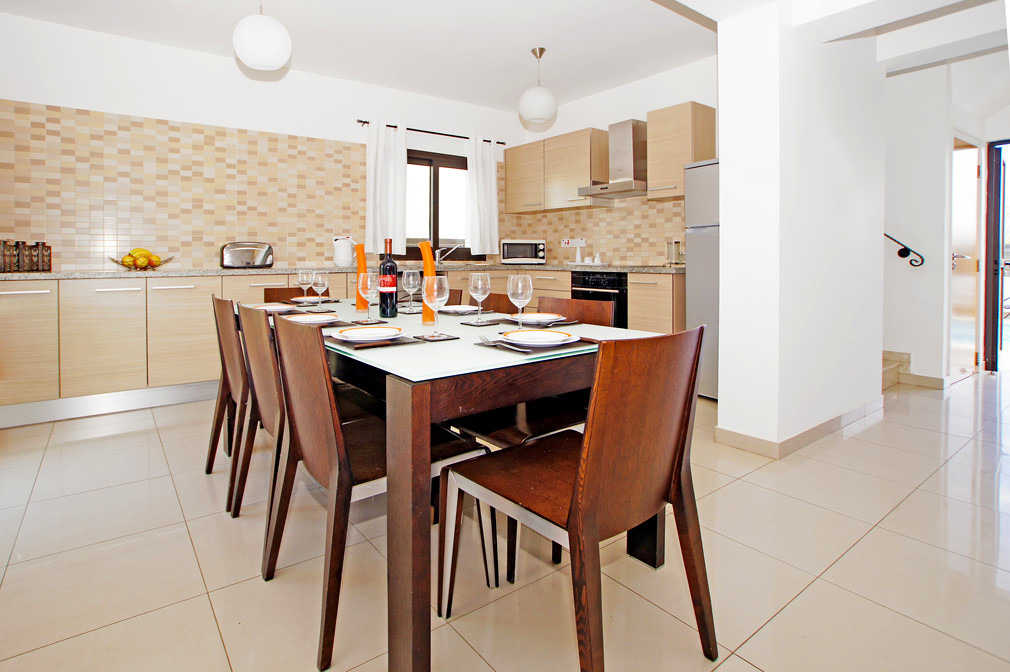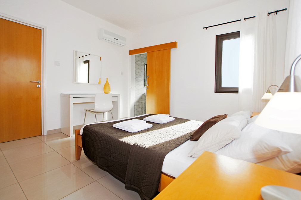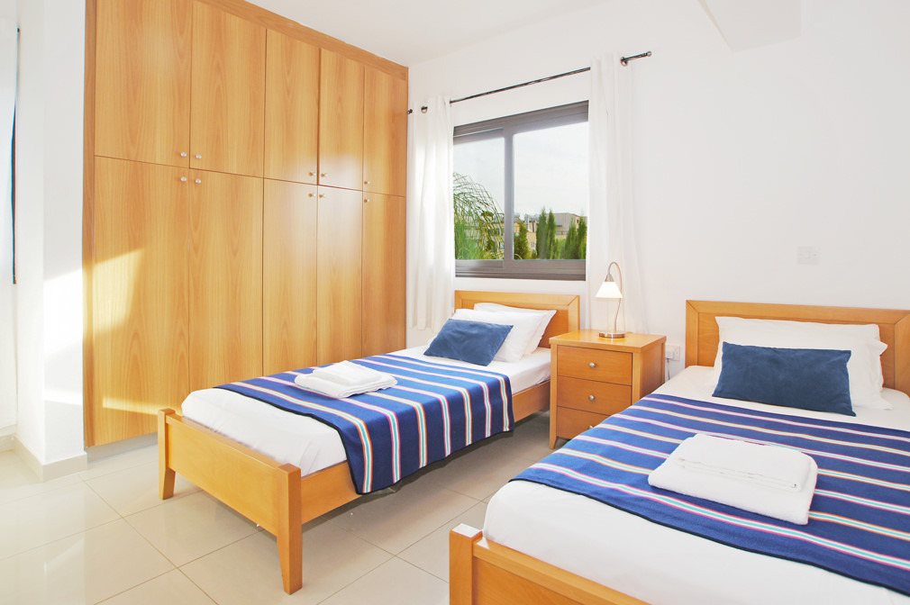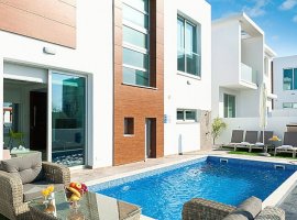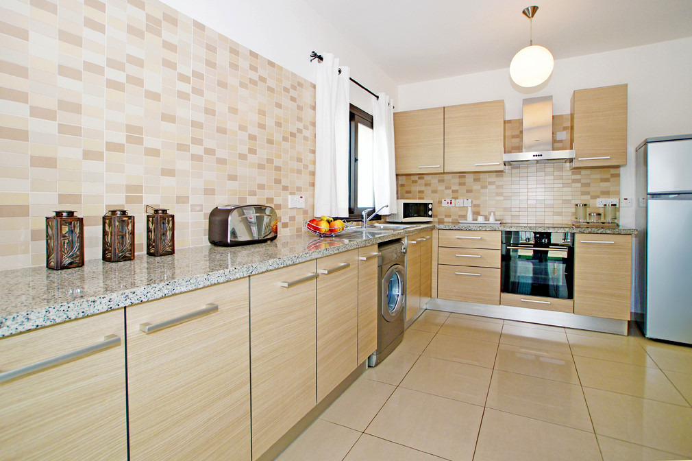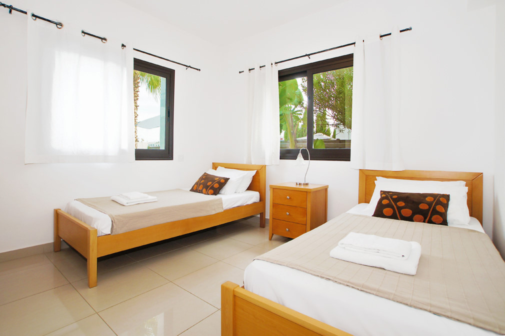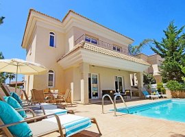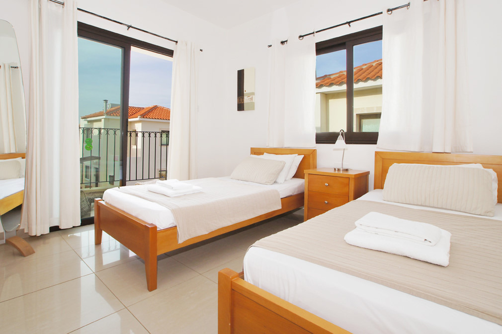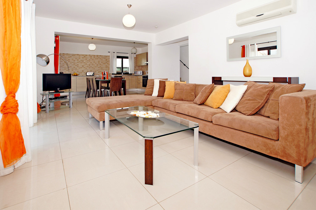 Dit Cyprus vakantiehuis is goed uitgerust en van ideale grootte. Via de ingang komt U in een prachtig ingericht en gemeubileerd woonkamer terecht met een grote en comfortabele sofa. Een LCD tv met satelliet (beperkte kanalen) en DVD entertainment-unit zijn beschikbaar. De moderne, zeer grote keuken is goed ingericht met wasmachine en magnetron. De elegante eettafel met 8 stoelen zorgt voor aangenaam tafelen. Op het gelijkvloers bevinden er zich een slaapkamer en een badkamer. Boven zijn er nog eens drie slaapkamers, één met een eigen badkamer. Vanaf het balkon kan men genieten van een zijzicht op zee. Het huis is volledig voorzien van airconditioning (inbegrepen in de prijs) en roken is alleen buiten toegestaan.