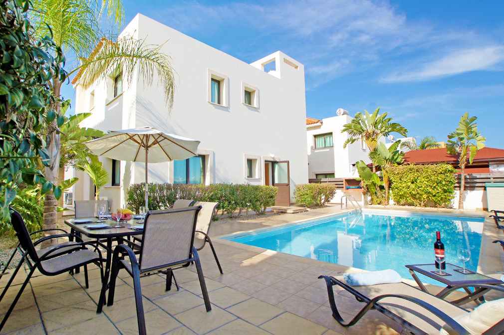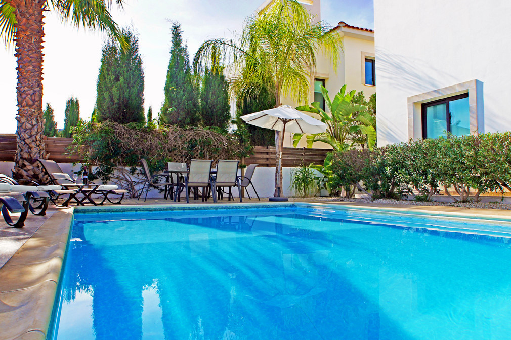 Buiten is er een groot zwembad 8x4 meter dat omgeven wordt door een zonneterras met ligstoelen en parasols. Tuinmeubilair en een barbecue zorgen voor een aangename avond. De tuin is mooi beplant en heeft hoge hekken die zorgen voor een goede persoonlijke levenssfeer bij het zwembad. Kapparis biedt enkele mooie stranden en sommige restaurants zijn het hele jaar open. De zee is slechts op ongeveer 500 meter van het huis en de eerste restaurants vindt U op ongeveer 200 meter.