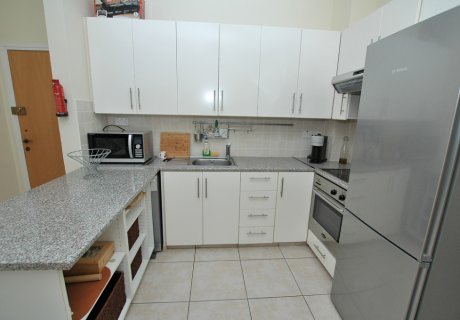Het appartement beschikt over twee slaapkamers met airconditioning, elk met twee eenpersoonsbedden. Eén slaapkamer heeft een eigen douche en toilet, en er is nog een aparte badkamer. De keuken is volledig uitgerust met een wasmachine, en er is een elegante eethoek met vier stoelen en een woonkamer met banken, een salontafel, wifi en een gemeubileerd balkon met uitzicht op zee. De slaapkamers, keuken en woonkamer zijn voorzien van airconditioning en plafondventilatoren.