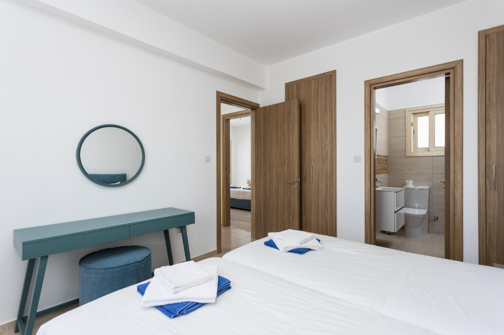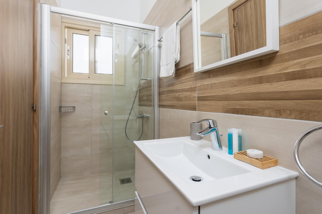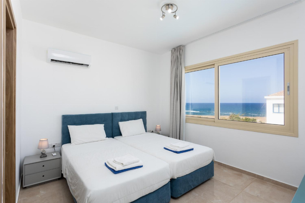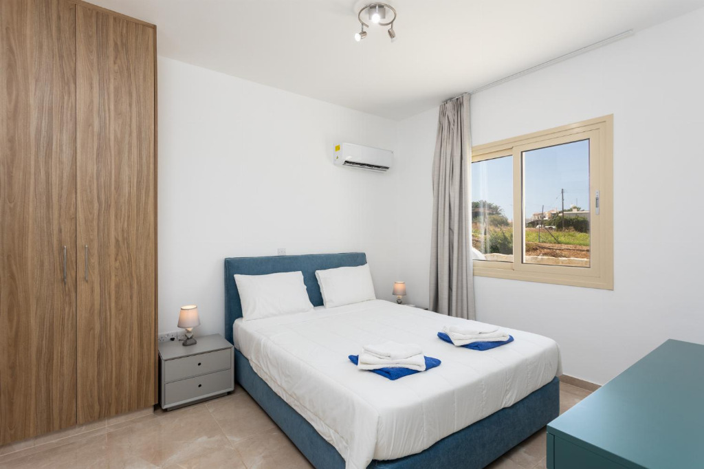 Eén van de slaapkamers bevindt zich op de begane grond en is ingericht met een tweepersoonsbed en heeft een eigen badkamer. Er is tevens een gastentoilet op de begane grond. Een trap leidt naar de bovenverdieping, waar zich nog 3 slaapkamers bevinden, elk met een eigen badkamer. Eén met een tweepersoonsbed en de andere twee met elk twee eenpersoonsbedden. Alle slaapkamers zijn voorzien van airconditioning, deze zijn bij de prijs inbegrepen. Voor de airconditioningunits in het woongedeelte geldt een toeslag.