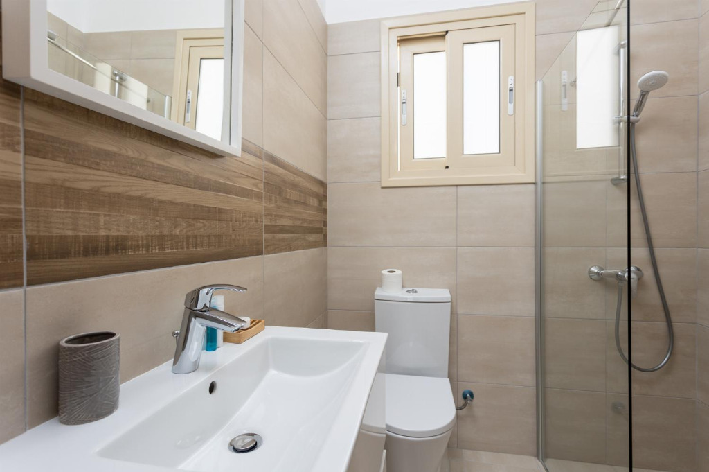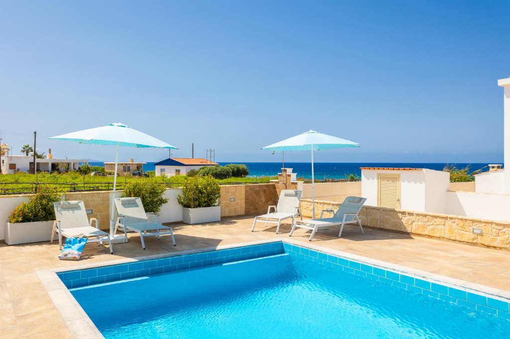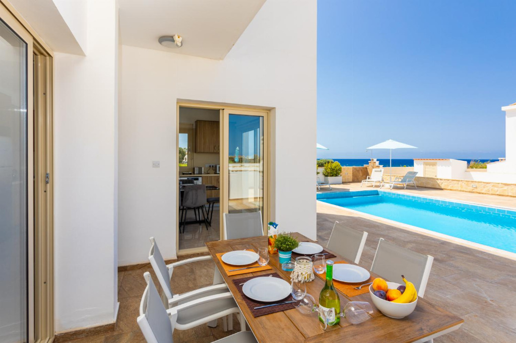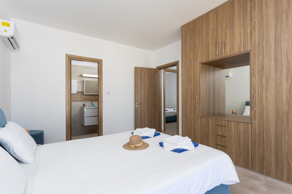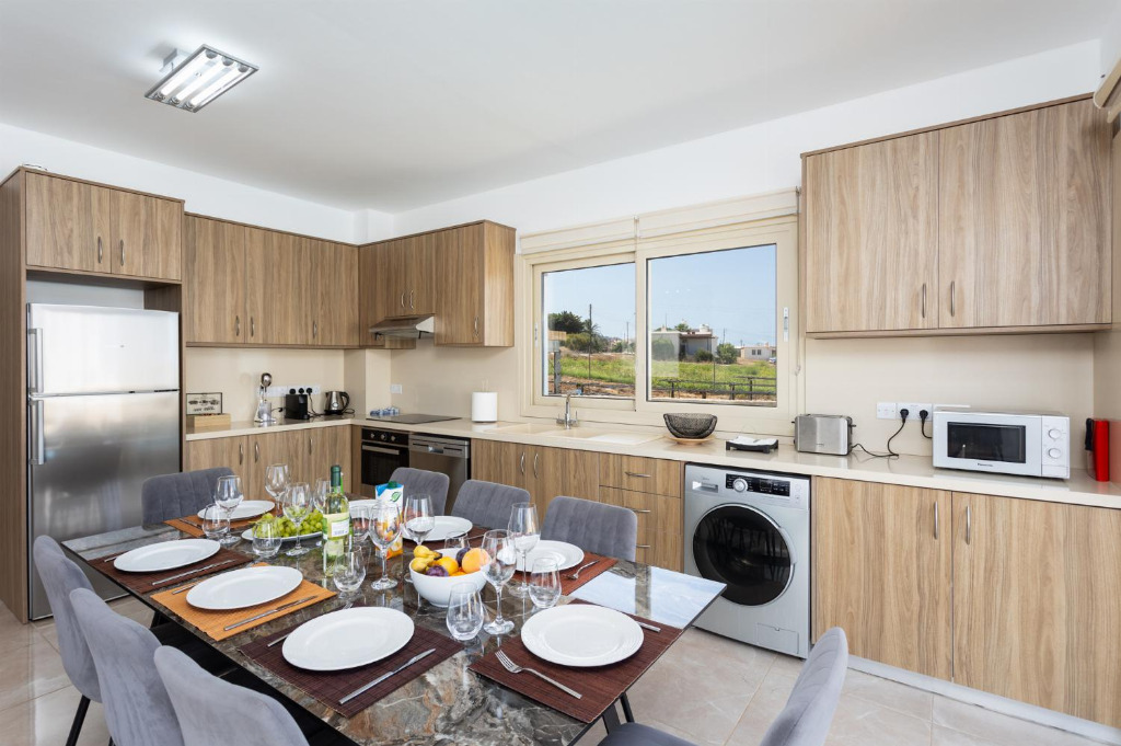 Deze nieuwe villa beschikt over 4 slaapkamers en is geschikt voor maximaal 8 personen. De entree leidt naar de open woon-/eetkamer en keuken. Het woongedeelte is prachtig modern ingericht met comfortabele banken, salontafel, tv en WiFi internet. Openslaande deuren bieden uitzicht op het overdekte terras en het zwembad. De keuken is volledig uitgerust, inclusief een vaatwasser en wasmachine. De elegante eettafel biedt ruimte aan 8 personen. Vanaf hier kunt u ook genieten van een prachtig uitzicht op de zee.