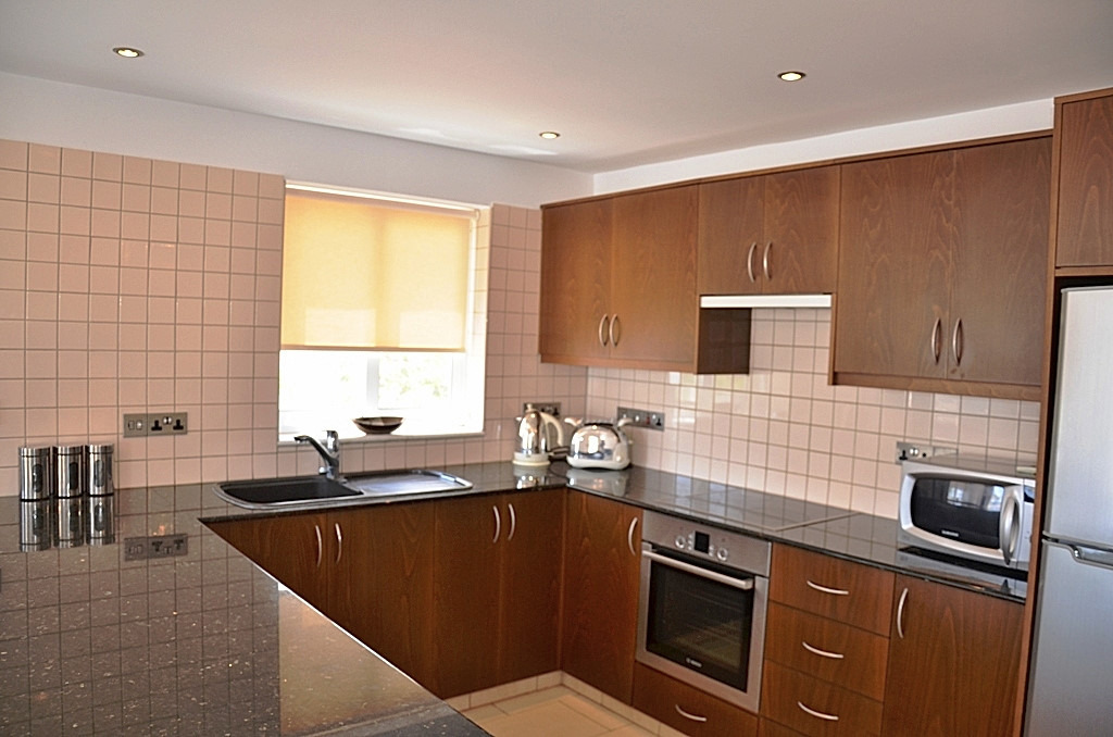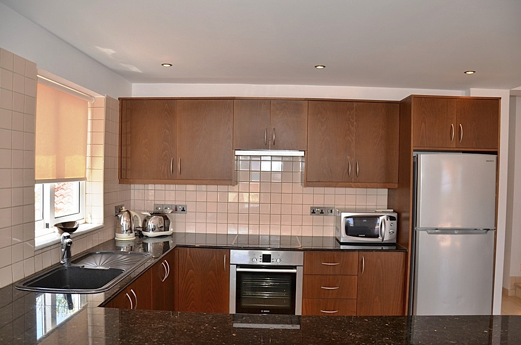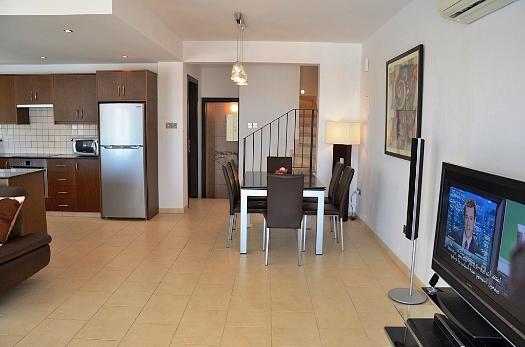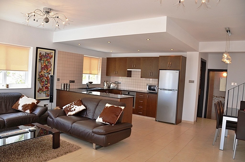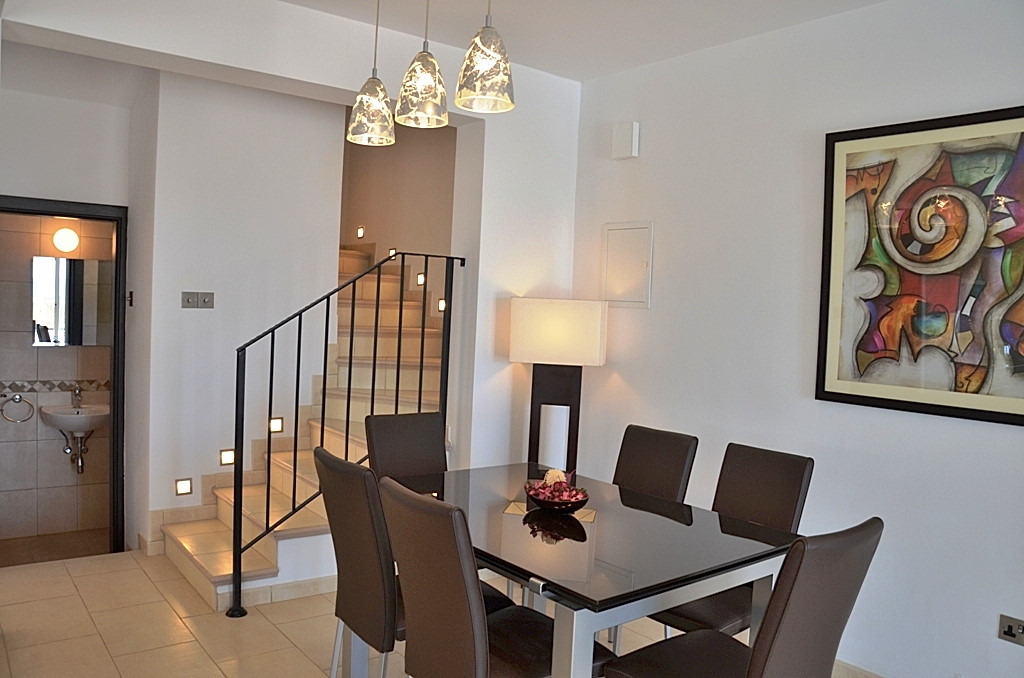 Op de begane grond de open woon / eetkamer met keuken. De woonkamer is uitgerust met een hoge kwaliteit donkere lederen sofa en een salontafel, TV met DVD en Wifi Internet. Zelfs de eetzaal is donker bewaard en heeft 6 stoelen. De hoogwaardige keuken is goed uitgerust en heeft, onder andere ook een wasmachine. Een van de slaapkamers is op de begane grond, en er is ook een badkamer met douche. Een trap leidt naar de eerste verdieping. Hier zijn nog twee slaapkamers en een complete badkamer. Een van de slaapkamers is ingericht met twee eenpersoonsbedden, de andere met een tweepersoonsbed, deze heeft ook toegang tot een groot balkon met prachtig uitzicht op zee.